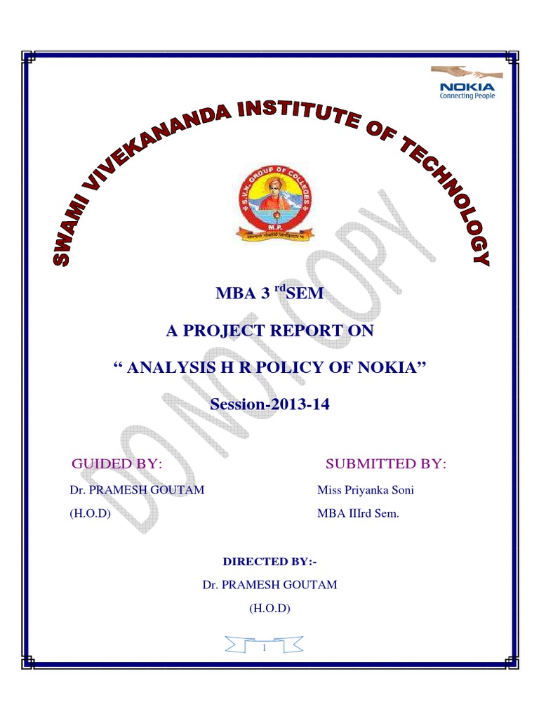 This is to certify that project report titled ANALYSIS H R POLICE OF NOKIA has successfully completed by Ms. Priyanka Soni M.B.A 3nd Semester student under the guidance of Dr. PRAMESH GOUTAM for the partial fulfillment for the award degree of master of business Administrator