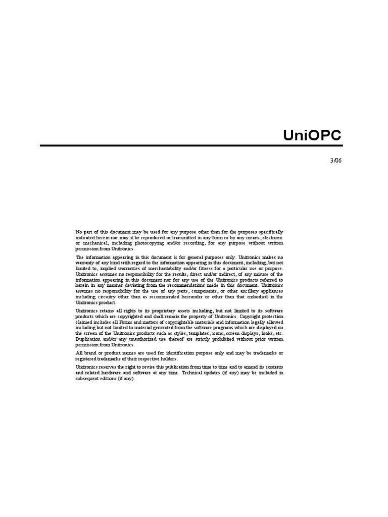 No part of this document may be used for any purpose other than for the purposes specifically indicated herein nor may it be reproduced or transmitted in any form or by any means, electronic or mechanical, including photocopying and/or recording, for any purpose without written permission from Unitronics. The information appearing in this document is for general purposes only. Unitronics makes no warranty of any kind with regard to the information appearing in this document, including, but not limited to, implied warranties of merchantability and/or fitness for a particular use or purpose. Unitronics assumes no responsibility for the results, direct and/or indirect, of any misuse of the information appearing in this document nor for any use of the Unitronics products referred to herein in any manner deviating from the recommendations made in this document. Unitronics assumes no responsibility for the use of any parts, components, or other ancillary appliances including circuitry other than as recommended hereunder or other than that embodied in the Unitronics product. Unitronics retains all rights to its proprietary assets including, but not limited to its software products which are copyrighted and shall remain the property of Unitronics. Copyright protection claimed includes all Forms and matters of copyrightable materials and information legally allowed including but not limited to material generated from the software programs which are displayed on the screen of the Unitronics products such as styles, templates, icons, screen displays, looks, etc. Duplication and/or any unauthorized use thereof are strictly prohibited without prior written permission from Unitronics. All brand or product names are used for identification purpose only and may be trademarks or registered trademarks of their respective holders. Unitronics reserves the right to revise this publication from time to time and to amend its contents and related hardware and software at any time. Technical updates (if any) may be included in subsequent editions (if any).