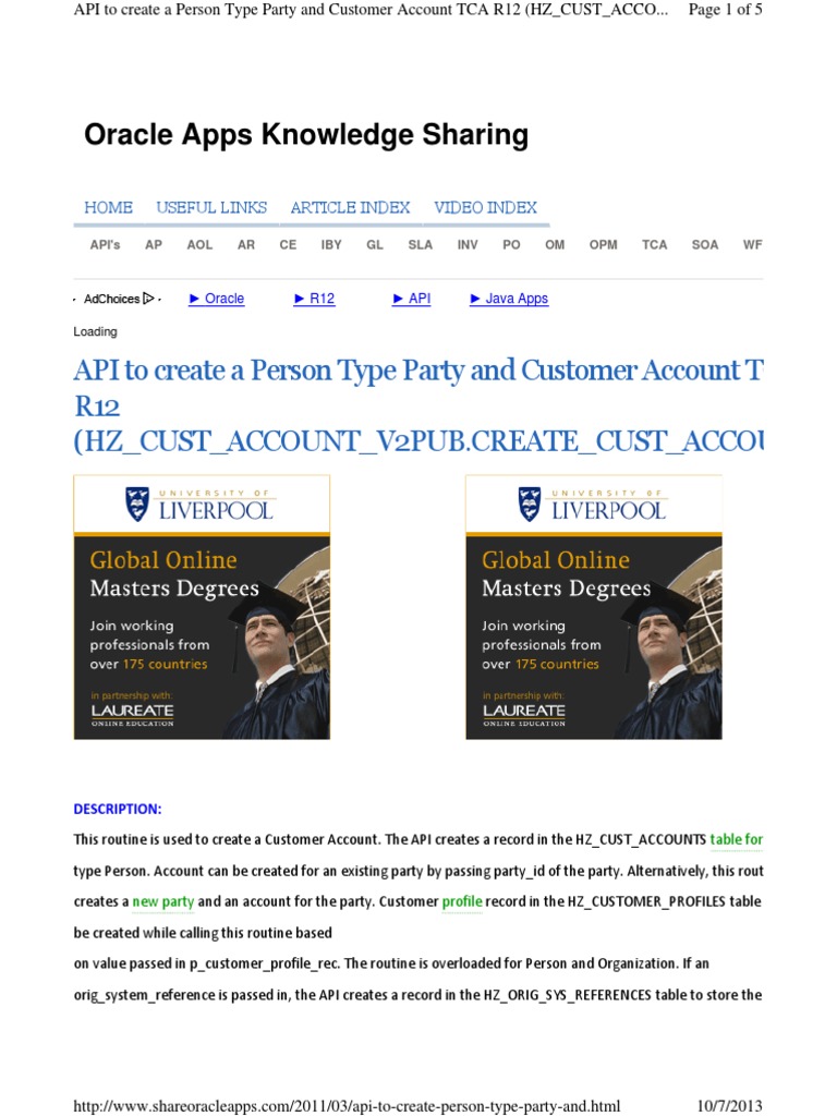 HZ_CUST_ACCOUNT_V2PUB.CREATE_CUST_ACCOUNT ( p_init_msg_list p_cust_account_rec p_person_rec p_create_profile_amt x_cust_account_id x_account_number x_party_id x_party_number x_profile_id x_return_status x_msg_count x_msg_data ); IF x_return_status = fnd_api.g_ret_sts_success THEN COMMIT; DBMS_OUTPUT.PUT_LINE('Creation of Party of Type Person and customer account is Successful '); DBMS_OUTPUT.PUT_LINE('Output information ....'); DBMS_OUTPUT.PUT_LINE('x_cust_account_id DBMS_OUTPUT.PUT_LINE('x_account_number DBMS_OUTPUT.PUT_LINE('x_party_id DBMS_OUTPUT.PUT_LINE('x_party_number DBMS_OUTPUT.PUT_LINE('x_profile_id ELSE DBMS_OUTPUT.put_line ('Creation of Party of Type Person and customer account failed:'||x_msg_data); ROLLBACK; FOR i IN 1 .. x_msg_count LOOP x_msg_data := oe_msg_pub.get( p_msg_index => i, p_encoded => 'F'); dbms_output.put_line( i|| ') '|| x_msg_data); END LOOP; END IF; DBMS_OUTPUT.PUT_LINE('Completion of API'); END; / : '||x_cust_account_id); : '||x_account_number); : '||x_party_id); : '||x_party_number); : '||x_profile_id); => FND_API.G_TRUE, =>p_cust_account_rec, =>p_person_rec, =>'F', =>x_cust_account_id, =>x_account_number, =>x_party_id, =>x_party_number, =>x_profile_id, =>x_return_status, => x_msg_count, =>x_msg_data