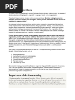 Decision-making is an essential aspect of modern management. It is a primary function of management. A manager's major job is sound/rational decision-making. He takes hundreds of decisions consciously and subconsciously. Decision-making is the key part of manager's activities. Decisions are important as they determine both managerial and organi ational actions. A decision may be defined as !a course of action "hich is consciously chosen from among a set of alternatives to achieve a desired result.! It represents a "ell-balanced judgment and a commitment to action. It is rightly said that the first important function of management is to take decisions on problems and situations. Decision-making pervades all managerial actions. It is a continuous process. Decision-making is an indispensable component of the management process itself.
