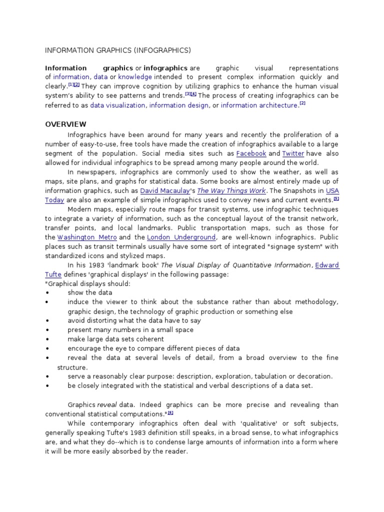 In ographics have .een aroun# or !an( (ears an# recentl( the proli eration o a nu!.er o eas(3to3use" ree tools have !a#e the creation o in ographics availa.le to a large seg!ent o the population) Social !e#ia sites such as Face.oo$ an# T%itter have also allo%e# or in#ivi#ual in ographics to .e sprea# a!ong !an( people aroun# the %orl#) In ne%spapers" in ographics are co!!onl( use# to sho% the %eather" as %ell as !aps" site plans" an# graphs or statistical #ata) So!e .oo$s are al!ost entirel( !a#e up o in or!ation graphics" such as 4avi# Macaula(5s The Way Things Work) The Snapshots in 6SA To#a( are also an e&a!ple o si!ple in ographics use# to conve( ne%s an# current events) *7, Mo#ern !aps" especiall( route !aps or transit s(ste!s" use in ographic techni'ues to integrate a variet( o in or!ation" such as the conceptual la(out o the transit net%or$" trans er points" an# local lan#!ar$s) Pu.lic transportation !aps" such as those or the 8ashington Metro an# the 9on#on 6n#ergroun#" are %ell3$no%n in ographics) Pu.lic places such as transit ter!inals usuall( have so!e sort o integrate# :signage s(ste!: %ith stan#ar#i/e# icons an# st(li/e# !aps) In his +;<1 5lan#!ar$ .oo$5 The Visual Display of Quantitative Information " =#%ar# Tu te #e ines 5graphical #ispla(s5 in the ollo%ing passage> :Graphical #ispla(s shoul#> sho% the #ata in#uce the vie%er to thin$ a.out the su.stance rather than a.out !etho#olog(" graphic #esign" the technolog( o graphic pro#uction or so!ething else avoi# #istorting %hat the #ata have to sa( present !an( nu!.ers in a s!all space !a$e large #ata sets coherent encourage the e(e to co!pare #i erent pieces o #ata reveal the #ata at several levels o #etail" ro! a .roa# overvie% to the ine structure) serve a reasona.l( clear purpose> #escription" e&ploration" ta.ulation or #ecoration) .e closel( integrate# %ith the statistical an# ver.al #escriptions o a #ata set) Graphics reveal #ata) In#ee# graphics can .e !ore precise an# revealing than conventional statistical co!putations):*?, 8hile conte!porar( in ographics o ten #eal %ith 5'ualitative5 or so t su.@ects" generall( spea$ing Tu te5s +;<1 #e inition still spea$s" in a .roa# sense" to %hat in ographics are" an# %hat the( #o33%hich is to con#ense large a!ounts o in or!ation into a or! %here it %ill .e !ore easil( a.sor.e# .( the rea#er)