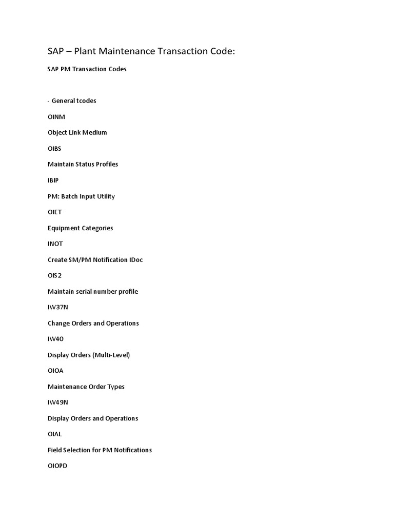 - General tcodes OINM Object Link Medium OIBS Maintain Status Profiles IBIP PM: Batch Input Utility OIET Equipment Categories INOT Create SM/PM Notification IDoc OIS2 Maintain serial number profile IW37N Change Orders and Operations IW40 Display Orders (Multi-Level) OIOA Maintenance Order Types IW49N Display Orders and Operations OIAL Field Selection for PM Notifications OIOPD