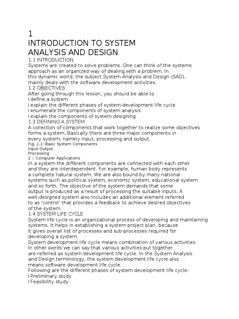 1.1 INTRODUCTION Systems are created to solve pro lems. O!e ca! t"#!$ o% t"e systems approac" as a! or&a!#'ed (ay o% deal#!& (#t" a pro lem. I! t"#s dy!am#c (orld) t"e s* +ect System A!alys#s a!d Des#&! ,SAD-) ma#!ly deals (#t" t"e so%t(are developme!t act#v#t#es. 1.. O/0ECTI1ES A%ter &o#!& t"ro*&" t"#s lesso!) yo* s"o*ld e a le to l de%#!e a system l e2pla#! t"e d#%%ere!t p"ases o% system developme!t l#%e cycle l e!*merate t"e compo!e!ts o% system a!alys#s l e2pla#! t"e compo!e!ts o% system des#&!#!& 1.3 DE4INING A SYSTEM A collect#o! o% compo!e!ts t"at (or$ to&et"er to real#'e some o +ect#ves %orms a system. /as#cally t"ere are t"ree ma+or compo!e!ts #! every system) !amely #!p*t) process#!& a!d o*tp*t.