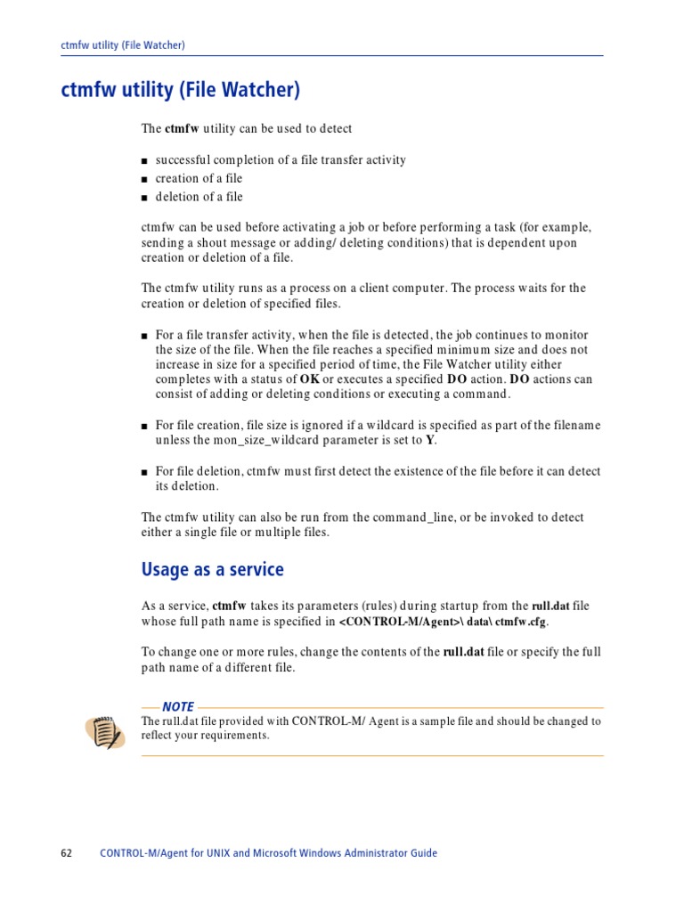 ctmfw can be used before activating a job or before performing a task (for example, sending a shout message or adding/deleting conditions) that is dependent upon creation or deletion of a file. The ctmfw utility runs as a process on a client computer. The process waits for the creation or deletion of specified files.