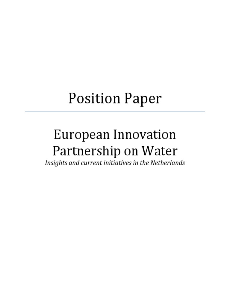 The aim of the EIP on Water is to speed up innovations that make a significant contribution to solving societal and environmental water challenges. In doing so, Europes competitiveness should be enhanced, contributing to job creation and economic growth. This position paper is written to outline water challenges and to describe key priority areas to boost economic development. The goal is to present the issues that are of added value for the Netherlands to join forces in the European Union. The aim is to stimulate cooperation and innovation in Europe.