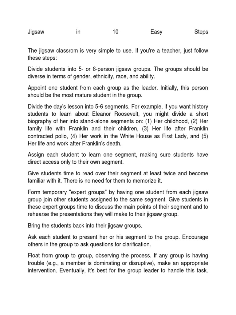 Research suggests that jigsaw has its strongest effect if introduced in elementary school. When children have been exposed to jigsaw in their early years, little more than a "booster shot" (one hour per day) of jigsaw in middle school and high school is required to maintain the benefits of cooperative learning. But what if jigsaw has not been used in elementary school? Admittedly, it is an uphill battle to introduce cooperative learning to 16-year olds who have never before experienced it. Old habits are not easy to break. But they can be broken, and it is never too late to begin. Experience has shown that although it generally takes a bit longer, most high school students participating in jigsaw for the first time display a remarkable ability to benefit from the cooperative structure. In Conclusion Some teachers may feel that they have already tried a cooperative learning approach because they have occasionally placed their students in small groups, instructing them to cooperate. Yet cooperative learning requires more than seating youngsters around a table and telling them to share, work together, and be nice to one another. Such loose, unstructured situations do not contain the crucial elements and safeguards that make the jigsaw and other structured cooperative strategies work so well.