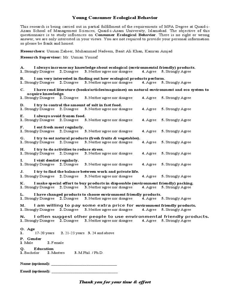 This research is being carried out in partial fulfillment of the requirements of MPA Degree at Quaid-iAzam School of Management Sciences, Quaid-i-Azam Uni ersit!, "slamabad# The ob$ecti e of this questionnaire is to stud! influences on Consumer Ecological Behavior# There is no right or %rong ans%er& %e are onl! interested in !our ie%s# 'ou are not required to pro ide !our personal information so please be fran( and honest# Researchers: Usman )aheer, Muhammad *adeem, +asit Ali ,han, ,amran Am$ad Research Supervisor: Mr# Usman 'ousaf