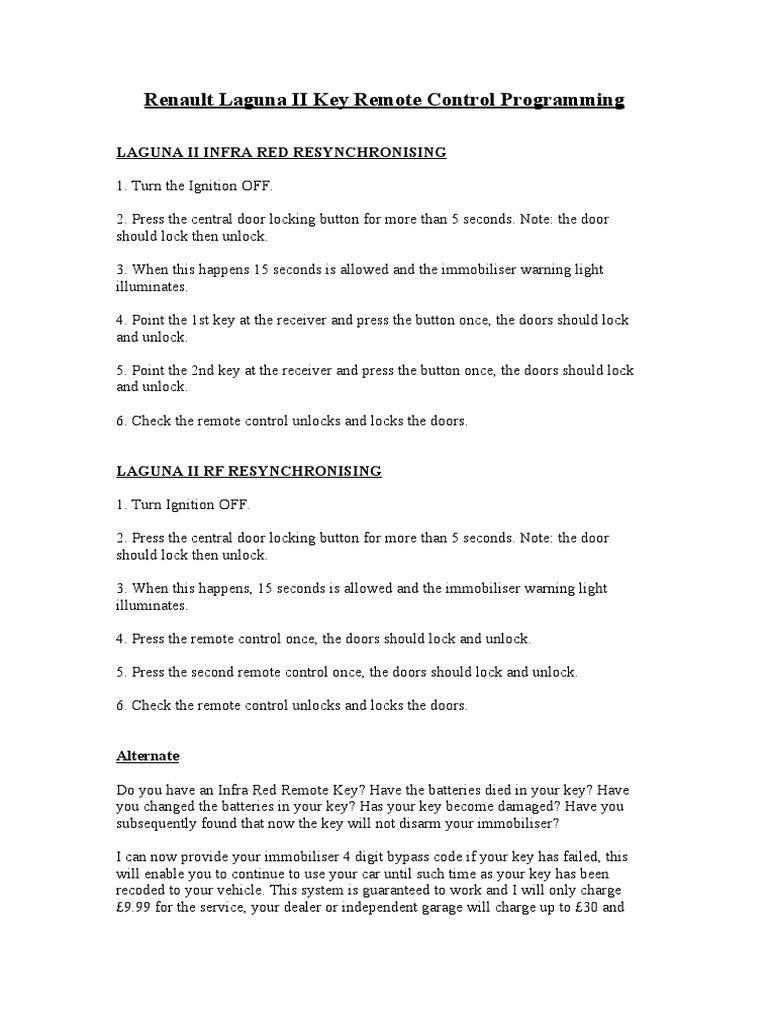 LAGUNA II INFRA RED RESYNCHRONISING 1. Turn the Ignition OFF. 2. Press the central door locking button for more than 5 seconds. Note: the door should lock then unlock. 3. hen this ha!!ens 15 seconds is allo"ed and the immobiliser "arning light illuminates. #. Point the 1st ke$ at the recei%er and !ress the button once& the doors should lock and unlock. 5. Point the 2nd ke$ at the recei%er and !ress the button once& the doors should lock and unlock. '. (heck the remote control unlocks and locks the doors. LAGUNA II RF RESYNCHRONISING 1. Turn Ignition OFF. 2. Press the central door locking button for more than 5 seconds. Note: the door should lock then unlock. 3. hen this ha!!ens& 15 seconds is allo"ed and the immobiliser "arning light illuminates. #. Press the remote control once& the doors should lock and unlock. 5. Press the second remote control once& the doors should lock and unlock. '. (heck the remote control unlocks and locks the doors. Alternate )o $ou ha%e an Infra *ed *emote +e$, -a%e the batteries died in $our ke$, -a%e $ou changed the batteries in $our ke$, -as $our ke$ become damaged, -a%e $ou subse.uentl$ found that no" the ke$ "ill not disarm $our immobiliser, I can no" !ro%ide $our immobiliser # digit b$!ass code if $our ke$ has failed& this "ill enable $ou to continue to use $our car until such time as $our ke$ has been recoded to $our %ehicle. This s$stem is guaranteed to "ork and I "ill onl$ charge /0.00 for the ser%ice& $our dealer or inde!endent garage "ill charge u! to /31 and
