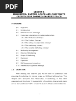 UNIT I Definition: Marketing Management The American Marketing Association offers this managerial definition: Marketing (management) is the process of planning and executing the conception, pricing, promotion, and distribution of ideas, goods, and services to create exchanges that satisfy individual and organizational goals Definition: Marketing Marketing is a societal process by which individuals and groups obtain what they need and want through creating, offering, and exchanging products and services of value freely with others. Marketing Tasks A recent book, Radical Marketing, praises companies such as Harley-Davidson for succeeding by breaking all of the rules of marketing. Instead of commissioning expensive marketing research, spending huge sums on advertising, and operating large marketing departments, these companies stretch their limited resources, live close to their customers, and create more satisfying solutions to customers needs. They form buyers clubs, use creative public relations, and focus on delivering quality products to win long-term customer loyalty. It seems that not all marketing must follow the P&G model. In fact, we can distinguish three stages through which marketing practice might pass: 1. Entrepreneurial marketing: Most companies are started by individuals who visualize an opportunity and knock on every door to gain attention. Jim Koch, founder of Boston Beer Company, whose Samuel Adams beer has become a top-selling craft beer, started out in 1984 carrying bottles of Samuel Adams from bar to bar to persuade bartenders to carry it. For 10 years, he sold his beer through direct selling and grassroots public relations. Today his business pulls in nearly $200 million, making it the leader in the U.S. craft beer market. 2. Formulated marketing: As small companies achieve success, they inevitably move toward more formulated marketing. Boston Beer recently began a $15 million television advertising campaign. The company now employs more that 175 salespeople and has a marketing department that carries on market research, adopting some of the tools used in professionally run marketing companies. 3. Intrepreneurial marketing: Many large companies get stuck in formulated marketing, poring over the latest ratings, scanning research reports, trying to fine-tune dealer relations and advertising messages. These companies lack the creativity and passion of the guerrilla marketers in the entrepreneurial stage. Their brand and product managers need to start living with their customers and visualizing new ways to add value to their customers lives. The bottom line is that effective marketing can take many forms. Although it is easier to learn the formulated side (which will occupy most of our attention in this book), we will also see how creativity and passion can be used by todays and tomorrows marketing managers.