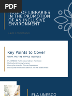 Introduction These guidelines have been compiled and published in order to promote fairness and equity of access in library services to multicultural communities. The guidelines, provide a basis for the planning of library services to all groups in the community; provide criteria against which the adequacy of existing multicultural services may be assessed; provide an equitable basis for the acquisition of materials and the provision of services; encourage understanding and engagement among the multicultural groups represented in all societies.