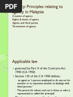 Assignment # 3 Humaira Shafiq Student No. 14004 (A) By an Express agreement: When such agreement is written or spoken it is express (B) By Implication: When agreement is by conduct, situation or relationship of parties. Implied agency may be (i) By estopple; (ii) By holding; (iii) By necessity (as in emergency, for safety of principal, between husband and wife) (iv) By operation of law. (C) By Ratification: Where acts are done by person on behalf of another but without the knowledge or authority, he may elect to ratify such acts. If he ratifies them, the same effects will follow as if those had been performed. Normally lawful consideration is one of the essential elements to constitute a valid agreement. An agreement enforceable by law is called a contract. All agreements are contract if they are made by free consent of parties, competent to contract, for a lawful consideration and with a lawful object and not expressly declared as void. There are certain distinct points in the case of an agreement agency. As for consideration it is not necessary to create an agency. As for intention to act on behalf of principal, the agent must have intention to act on behalf of the principal.