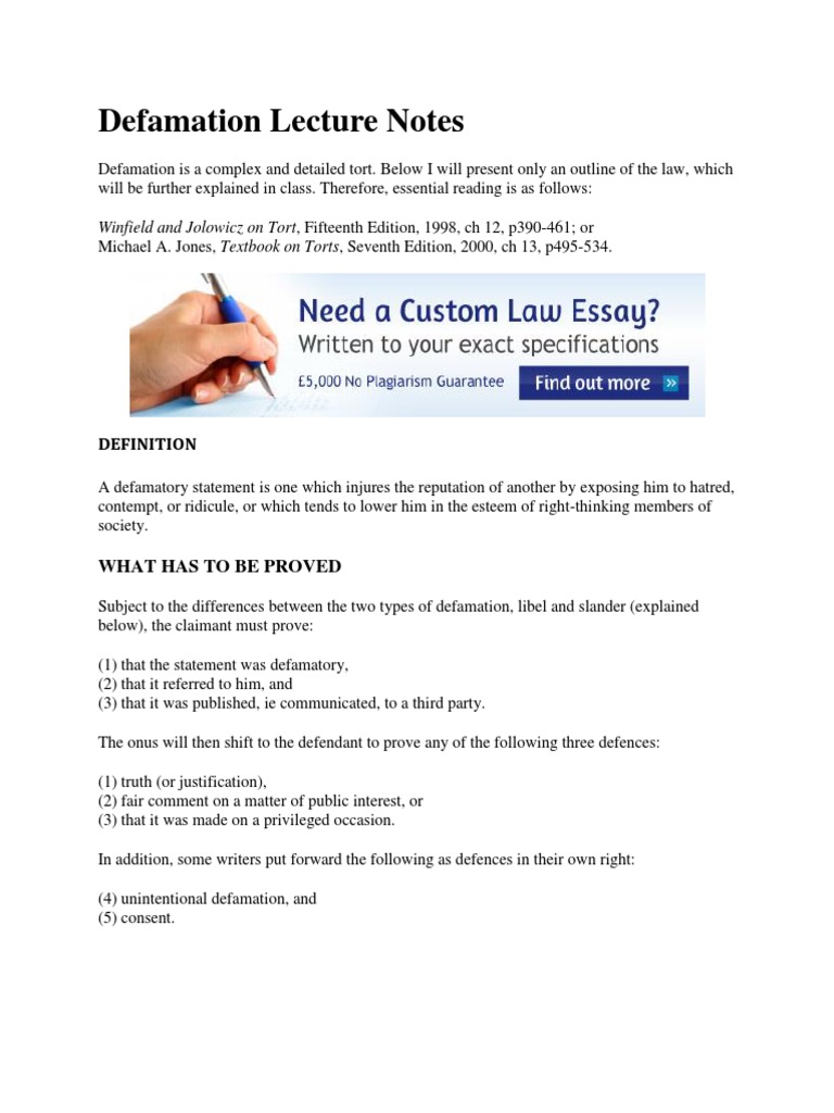 Read more: Defamation Lecture Notes | Resources for Law Essay Writing | Law Teacher http://www.lawteacher.net/tort-law/lecture-notes/defamation-lecture.php#ixzz2l9B3Xuw8 Follow us: @lawteachernet on Twitter | LawTeacherNet on Facebook