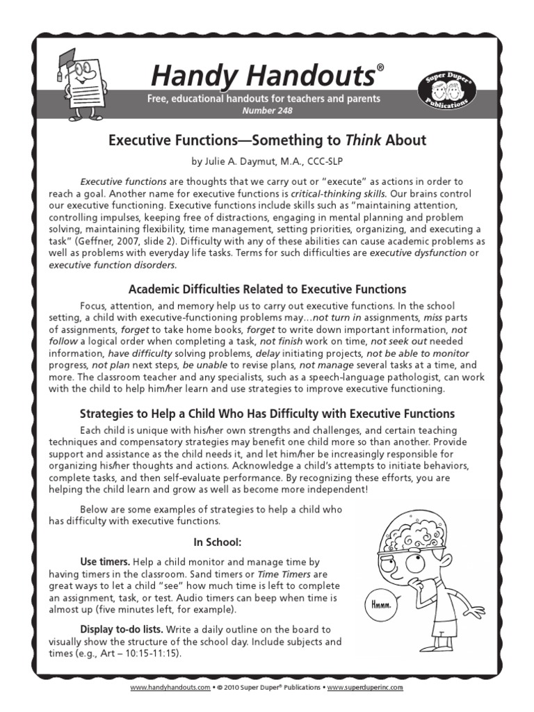 by Julie A. Daymut, M.A., CCC-SLP Executive functions are thoughts that we carry out or execute as actions in order to reach a goal. Another name for executive functions is critical-thinking skills. Our brains control our executive functioning. Executive functions include skills such as maintaining attention, controlling impulses, keeping free of distractions, engaging in mental planning and problem solving, maintaining flexibility, time management, setting priorities, organizing, and executing a task (Geffner, 2007, slide 2). Difficulty with any of these abilities can cause academic problems as well as problems with everyday life tasks. Terms for such difficulties are executive dysfunction or executive function disorders.