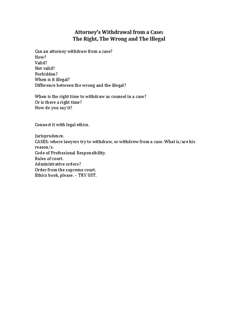 Can an attorney withdraw from a case? How? Valid? Not valid? Forbidden? When is it illegal? Difference between the wrong and the illegal? When is the right time to withdraw as counsel in a case? Or is there a right time? How do you say it? Connect it with legal ethics. Jurisprudence. CASES: where lawyers try to withdraw, or withdrew from a case. What is/are his reason/s. Code of Professional Responsibility. Rules of court. Administrative orders? Order from the supreme court. Ethics book, please. TRY UST.