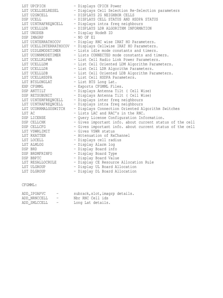Displays CPICH Power Displays Cell Selection Re-Selection parameters DISPLAYS 2G NEIGHBOR CELLS DISPLAYS CELL STATUS AND HSDPA STATUS Displays intra freq neighbours DISPLAYS LDR ALGORITHM INFORMATION Display NodeB ID NO OF E1 Display RNC wise IRAT HO Parameters. Displays Cellwise IRAT HO Parameters. Lists idle mode constants and timers. Lists CONNECTED mode constants and timers. List Cell Radio Link Power Parameters. List Cell Oriented LDM Algorithm Parameters. List Cell LDR Algorithm Parameters. List Cell Oriented LDB Algorithm Parameters. List Cell HSDPA Parameters. List BTS Long Lat. Exports CFGMML Files. Displays Antenna Tilt ( Cell Wise) Displays Antenna Tilt ( Cell Wise) Displays inter freq neighbours Displays intra freq neighbours Displays Connection Oriented Algorithm Switches Lists LAC and RAC's in the RNC. Query License Configuration Information. Gives important info. about current status of the cell Gives important info. about current status of the cell Gives VSWR status Attenuation of RxChannel Displays cell radius Display Alarm log Display Board info Display Board Type Display Board Value Display CE Resource Allocation Rule Display UL Board Allocation Display DL Board Allocation