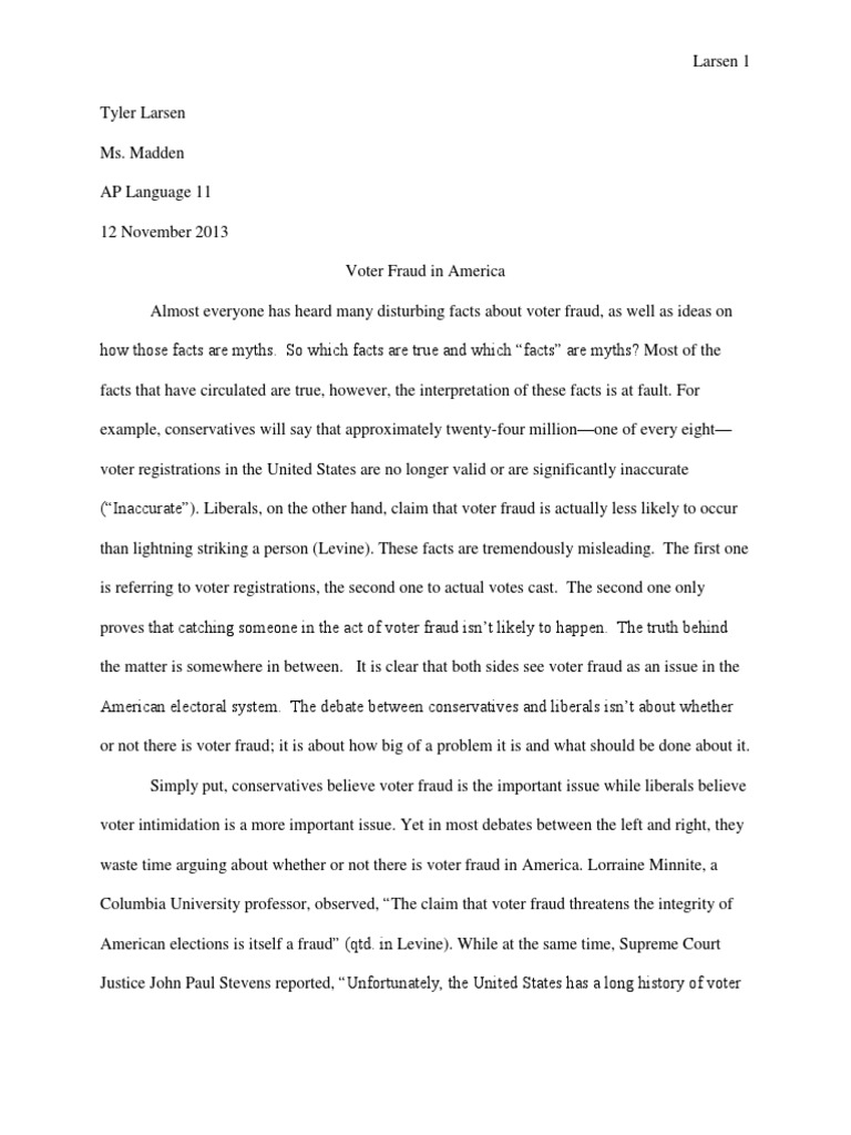 Larsen 2 fraud that has been documented by historians and journalists (qtd. in Fund). This debate is pointless and doesnt solve the problem. The left needs to realize that there is a noticeable amount of voter fraud in America, and the right needs to realize that trying to protect against voter fraud can lead to voter intimidation. Both parties want a fair and free election; they just disagree on how to make that happen. At the heart of this issue is the controversy surrounding voter ID laws. According to the
