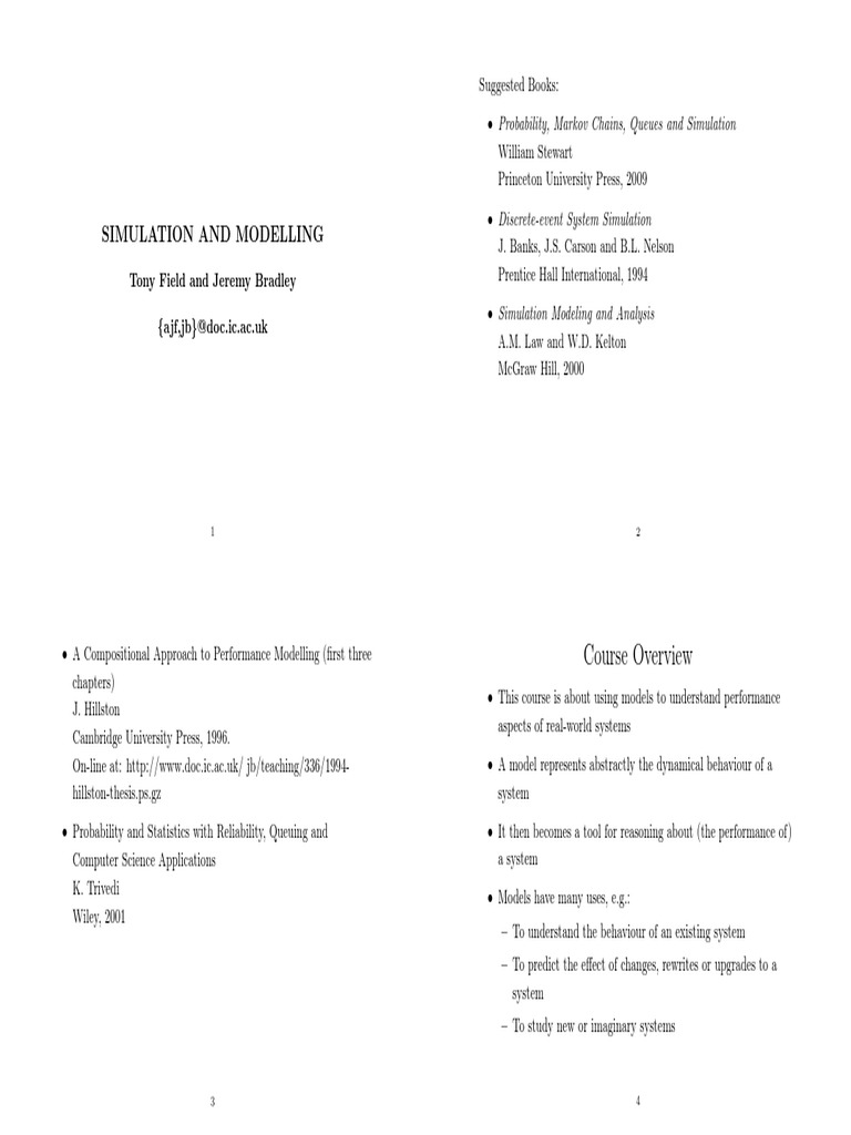 A Compositional Approach to Performance Modelling (rst three chapters) J. Hillston Cambridge University Press, 1996. On-line at: http://www.doc.ic.ac.uk/ jb/teaching/336/1994hillston-thesis.ps.gz Probability and Statistics with Reliability, Queuing and Computer Science Applications K. Trivedi Wiley, 2001