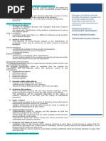 The process of identifying and choosing alternative courses of action in a manner appropriate to the demands of the situation. According to Nickels et al, it is the heart of all the management functions. DECISION-MAKING PROCESS 1. Diagnose problem 2. Analyze environment 3. Articulate problem or opportunity 4. Develop viable alternatives 5. Evaluate alternatives 6. Make a choice 7. Implement decision 8. Evaluate and adapt decision results Diagnose Problem To make an intelligent decision, the managers first move must be identify the problem. An expert said identification of the problem is tantamount to having the problem solved. What is a Problem? A problem exists when there is a difference between actual situation and a desired situation. Analyze Environment The objective of environmental analysis is the identification of constraints, which may be spelled out as either internal or external limitation. Internal Limitations 1. Limited fund available for the purchase of equipment. 2. Limited training on the part of employees. 3. Ill-designed facilities. External limitations 1. Patents are controlled by other organizations. 2. A very limited market for the companys products and services exists. 3. Strict enforcement of local zoning regulations.