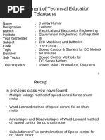 By this method speed control is obtained by any one of the following means 1. Field rheostat control of DC Shunt Motor: In this method , speed variation is accomplished by means of a variable resistance inserted in series with the shunt field . An increase in controlling resistances reduces the field current with a reduction in flux and an increase in speed. This method of speed control is independent of load on the motor. Power wasted in controlling resistance is very less as field current is a small value. This method of speed control is also used in DC compound motor. Limitations of this method of speed control: A. Creeping speeds cannot be obtained. B. Top speeds only obtained at reduced torque C. The speed is maximum at minimum value of flux, which is governed by the demagnetizing effect of armature reaction on the field. 2. Field voltage control: This method requires a variable voltage supply for the field circuit which is separated from the main power supply to which the armature is connected. Such a variable supply can be obtained by an electronic rectifier. Armature control of DC Shunt Motor Speed control by this method involves two ways . These are : 1. Armature resistance control : In this method armature circuit is provided with a variable resistance. Field is directly connected across the supply so flux is not changed due to variation of series resistance. This is applied for dc shunt motor. This method is used in printing press, cranes, hoists where speeds lower than rated is used for a short period only. 2. Armature voltage control: This method of speed control needs a variable source of voltage separated from the source supplying the field current. This method avoids disadvantages of poor speed regulation and low efficiency of armature-resistance control methods. The basic adjustable armature voltage control method of speed d control is accomplished by means of an adjustable voltage generator is called Ward Leonard system.