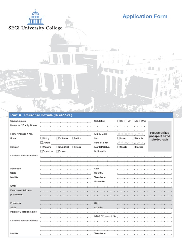 To ensure you receive a quick response to your application, please enclose the following documents: Application fee (cheque should be payable to SEGi University College (M) Sdn Bhd) 3 copies of colour passport-size photographs (6 copies for international/offshore students) 1 copy of identification card 3 copies of passport including blank pages (for international/offshore students only) 1 copy of certified student identification card and birth certificate (for MLVK Nursing students only) Curriculum vitae and a 100 word write-up detailing work experience for MBA applications (if applicable) 1 certified true copy of academic certificate/transcript for the following qualifications: Actual SPM O-Level STPM UEC A-Level SAM Bachelor Degree Forecast Others