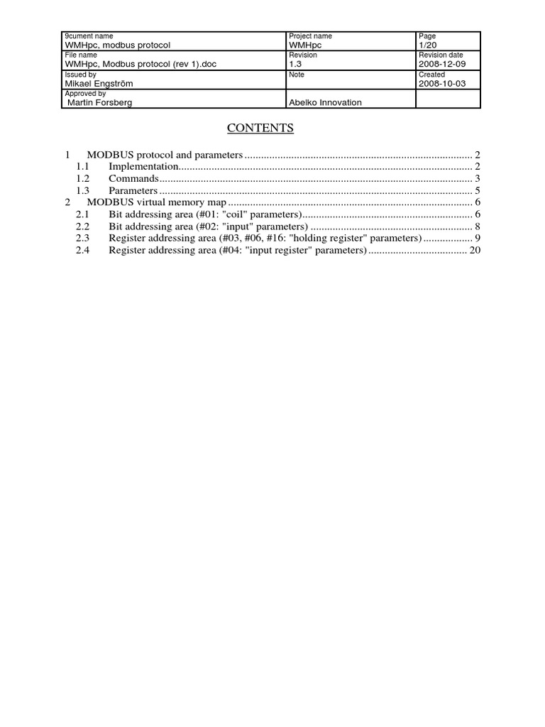 1 MODBUS protocol and parameters ................................................................................... 2 1.1 Implementation........................................................................................................... 2 1.2 Commands.................................................................................................................. 3 1.3 Parameters .................................................................................................................. 5 2 MODBUS virtual memory map ......................................................................................... 6 2.1 Bit addressing area (#01: "coil" parameters).............................................................. 6 2.2 Bit addressing area (#02: "input" parameters) ........................................................... 8 2.3 Register addressing area (#03, #06, #16: "holding register" parameters) .................. 9 2.4 Register addressing area (#04: "input register" parameters) .................................... 20