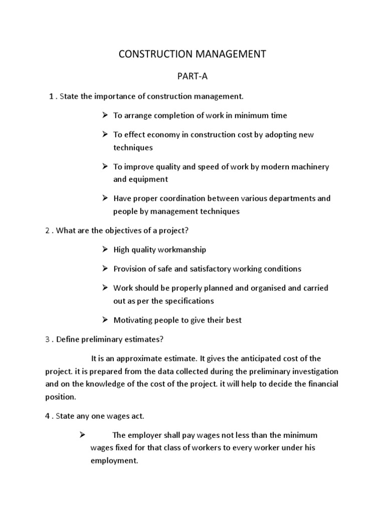 1 . State the importance of construction management. To arrange completion of work in minimum time To effect economy in construction cost by adopting new techniques To improve quality and speed of work by modern machinery and equipment Have proper coordination between various departments and people by management techniques 2 . What are the objectives of a project? High quality workmanship Provision of safe and satisfactory working conditions Work should be properly planned and organised and carried out as per the specifications Motivating people to give their best 3 . Define preliminary estimates? It is an approximate estimate. It gives the anticipated cost of the project. it is prepared from the data collected during the preliminary investigation and on the knowledge of the cost of the project. it will help to decide the financial position. 4 . State any one wages act. The employer shall pay wages not less than the minimum wages fixed for that class of workers to every worker under his employment.