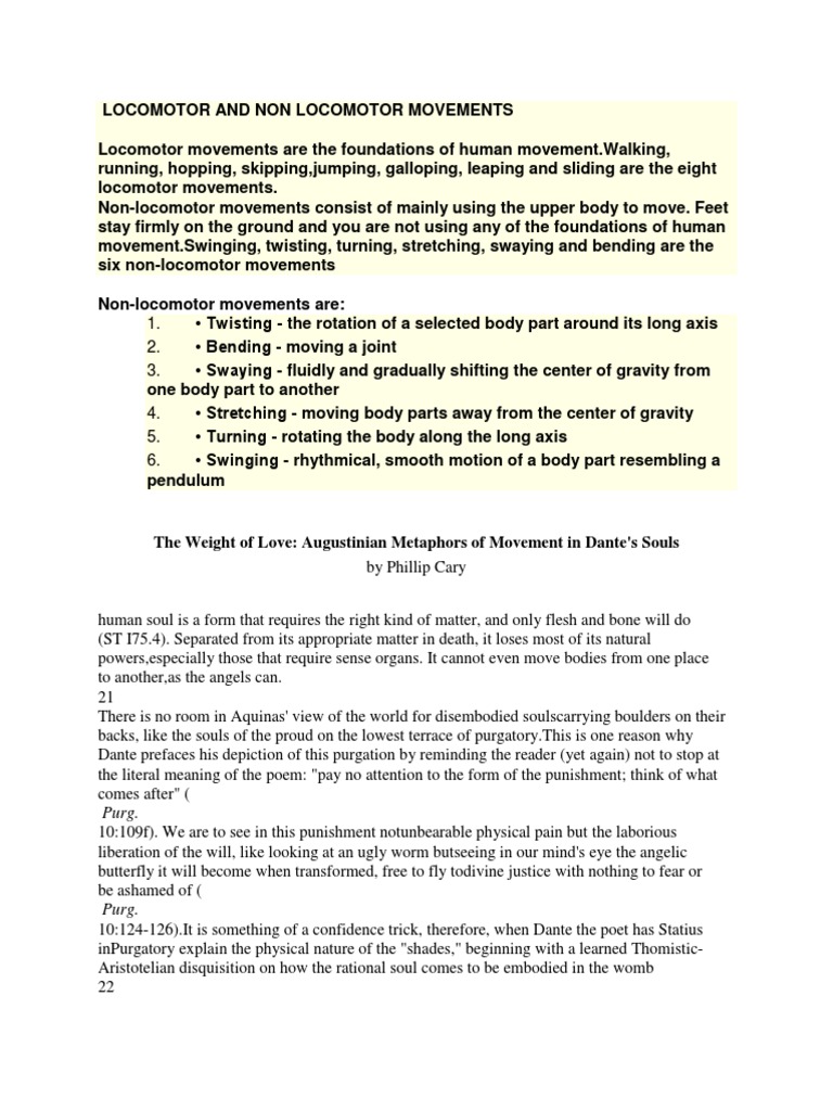 The Weight of Love: Augustinian Metaphors of Movement in Dante's Souls by Phillip Cary human soul is a form that requires the right kind of matter, and only flesh and bone will do (ST I75.4). Separated from its appropriate matter in death, it loses most of its natural powers,especially those that require sense organs. It cannot even move bodies from one place to another,as the angels can. 21 There is no room in Aquinas' view of the world for disembodied soulscarrying boulders on their backs, like the souls of the proud on the lowest terrace of purgatory.This is one reason why Dante prefaces his depiction of this purgation by reminding the reader (yet again) not to stop at the literal meaning of the poem: "pay no attention to the form of the punishment; think of what comes after" ( Purg. 10:109f). We are to see in this punishment notunbearable physical pain but the laborious liberation of the will, like looking at an ugly worm butseeing in our mind's eye the angelic butterfly it will become when transformed, free to fly todivine justice with nothing to fear or be ashamed of ( Purg. 10:124-126).It is something of a confidence trick, therefore, when Dante the poet has Statius inPurgatory explain the physical nature of the "shades," beginning with a learned ThomisticAristotelian disquisition on how the rational soul comes to be embodied in the womb 22