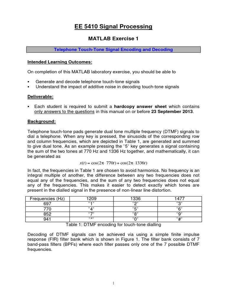 based on the frequency table in Table 1. A skeleton of dtmfdial.m is given as