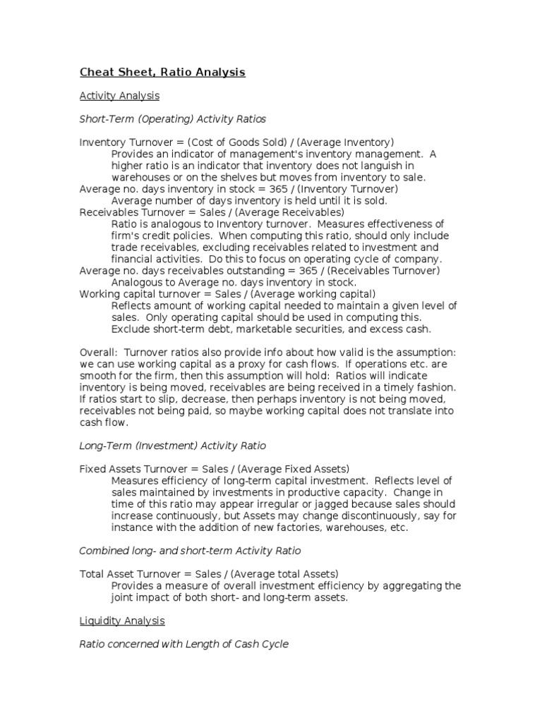 Activity Analysis Short-Term (Operating) Activity Ratios Inventory Turnover = (Cost of Goods Sold) / (Average Inventory) Provides an indicator of management's inventory management. A ig er ratio is an indicator t at inventory does not languis in !are ouses or on t e s elves "ut moves from inventory to sale. Average no. days inventory in stoc# = $%& / (Inventory Turnover) Average num"er of days inventory is eld until it is sold. 'eceiva"les Turnover = Sales / (Average 'eceiva"les) 'atio is analogous to Inventory turnover. (easures effectiveness of firm's credit )olicies. * en com)uting t is ratio+ s ould only include trade receiva"les+ e,cluding receiva"les related to investment and financial activities. -o t is to focus on o)erating cycle of com)any. Average no. days receiva"les outstanding = $%& / ('eceiva"les Turnover) Analogous to Average no. days inventory in stoc#. *or#ing ca)ital turnover = Sales / (Average !or#ing ca)ital) 'eflects amount of !or#ing ca)ital needed to maintain a given level of sales. .nly o)erating ca)ital s ould "e used in com)uting t is. /,clude s ort0term de"t+ mar#eta"le securities+ and e,cess cas . .verall1 Turnover ratios also )rovide info a"out o! valid is t e assum)tion1 !e can use !or#ing ca)ital as a )ro,y for cas flo!s. If o)erations etc. are smoot for t e firm+ t en t is assum)tion !ill old1 'atios !ill indicate inventory is "eing moved+ receiva"les are "eing received in a timely fas ion. If ratios start to sli)+ decrease+ t en )er a)s inventory is not "eing moved+ receiva"les not "eing )aid+ so may"e !or#ing ca)ital does not translate into cas flo!. Long-Term (Investment) Activity Ratio 2i,ed Assets Turnover = Sales / (Average 2i,ed Assets) (easures efficiency of long0term ca)ital investment. 'eflects level of sales maintained "y investments in )roductive ca)acity. C ange in time of t is ratio may a))ear irregular or 3agged "ecause sales s ould increase continuously+ "ut Assets may c ange discontinuously+ say for instance !it t e addition of ne! factories+ !are ouses+ etc. Combined long- and short-term Activity Ratio Total Asset Turnover = Sales / (Average total Assets) Provides a measure of overall investment efficiency "y aggregating t e 3oint im)act of "ot s ort0 and long0term assets. 4i5uidity Analysis Ratio concerned with Length o Cash Cycle
