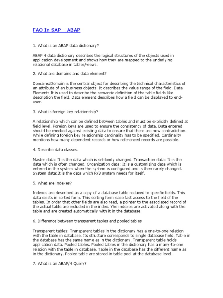 1. What is an ABAP data dictionary? ABAP 4 data dictionary describes the logical structures of the objects used in application development and shows how they are mapped to the underlying relational database in tables/views. 2. What are domains and data element? Domains:Domain is the central object for describing the technical characteristics of an attribute of an business objects. It describes the value range of the field. Data Element: It is used to describe the semantic definition of the table fields like description the field. Data element describes how a field can be displayed to enduser. 3. What is foreign key relationship? A relationship which can be defined between tables and must be explicitly defined at field level. Foreign keys are used to ensure the consistency of data. Data entered should be checked against existing data to ensure that there are now contradiction. While defining foreign key relationship cardinality has to be specified. Cardinality mentions how many dependent records or how referenced records are possible. 4. Describe data classes. Master data: It is the data which is seldomly changed. Transaction data: It is the data which is often changed. Organization data: It is a customizing data which is entered in the system when the system is configured and is then rarely changed. System data:It is the data which R/3 system needs for itself. 5. What are indexes? Indexes are described as a copy of a database table reduced to specific fields. This data exists in sorted form. This sorting form ease fast access to the field of the tables. In order that other fields are also read, a pointer to the associated record of the actual table are included in the index. Yhe indexes are activated along with the table and are created automatically with it in the database. 6. Difference between transparent tables and pooled tables Transparent tables: Transparent tables in the dictionary has a one-to-one relation with the table in database. Its structure corresponds to single database field. Table in the database has the same name as in the dictionary. Transparent table holds application data. Pooled tables. Pooled tables in the dictionary has a many-to-one relation with the table in database. Table in the database has the different name as in the dictionary. Pooled table are stored in table pool at the database level. 7. What is an ABAP/4 Query?