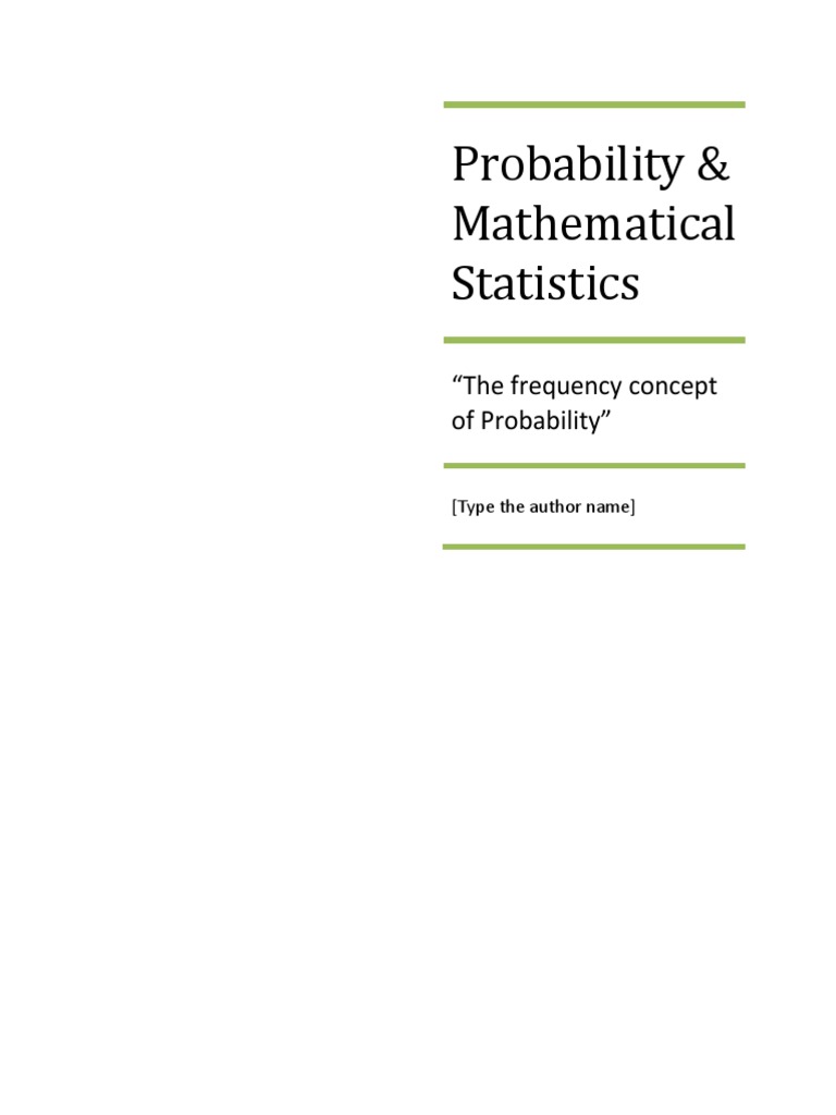 = 2, 3 = 3, 4 = 4, 5 = 5, and 6 = 6. With a coin, the n = 2 outcomes are 1 = H, 2 = T .Usually, well introduce a symbol for the outcome of an experiment, such as X, and call this symbol a random variable. So, if you ip a coin and an H comes up, then X = 1 = H, but if a T comes up, then X = 2 = T. Lets take the case of tossing a fair die. When its tossed, all six outcomes are equally probable, so they should all have the same probability. Well want the sum of all the probabilities of the outcomes to be 1, so for a fair die, each outcome will have probability 1/6. Well use a couple of notations to express the assumption that each of the probabilities of the outcomes of a fair die is 1/6. Sometimes, to emphasize that we have a measure for each outcome, well use the notation m(1) = m(2) = m(3) = m(4) = m(5) = m(6)=1/6. But, more often, we usually use a random variable and a probability notation P (X=1) = P (X=2) = P (X=3) = P (X=4) = P (X=5) = P (X=6) = 1/6. The probability notation is more convenient since we can use it to express probabilities other than X having a particular value. For example: P (X 5) expresses the probability that the die comes up with a value greater than or equal to 5, that is to say, either 5 or 6. Since each of 5 and 6 have probabilities of 1/6, therefore P (X 5) = 2/6 =1/3. Thus, the probability notation allows us to express probabilities of sets of outcomes, not just single outcomes. The set of all possible outcomes is called a sample space. For tossing a fair die, the sample space is = ,1, 2, 3, 4, 5, 6- = ,1, 2, 3, 4, 5, 6-. But a sample space is more than just a set; it also has measures for each of its elements. Thats the function m : *0, 1+ which assigns to each outcome i its measure m(i). This function m is called a distribution function or a probability mass function. Sometimes we come across a dierent symbol for it, like f. From m, we can derive probabilities for each subset E of the sample space . A subset E of the sample space, that is, a set E of some of the outcomes,is called an event. The probability P (E) of an event E is dened as the sum of measures of all the outcomes in the event. So, for example, we dene the probability of the event E of the outcome being greater than or equal to 5 as P (E) = P (X 5) = m(5) + m(6) =1/6 +1/6 =1/3.