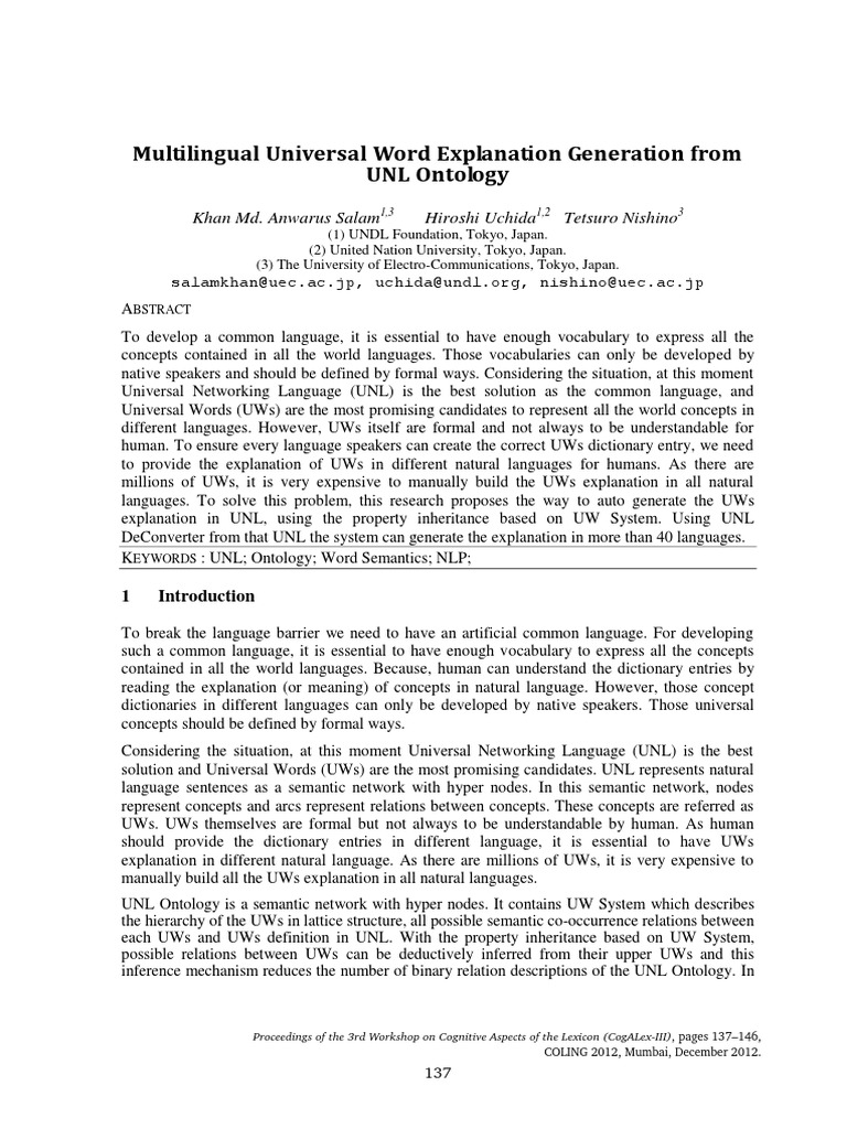 salamkhan@uec.ac.jp, uchida@undl.org, nishino@uec.ac.jp ABSTRACT To develop a common language, it is essential to have enough vocabulary to express all the concepts contained in all the world languages. Those vocabularies can only be developed by native speakers and should be defined by formal ways. Considering the situation, at this moment Universal Networking Language (UNL) is the best solution as the common language, and Universal Words (UWs) are the most promising candidates to represent all the world concepts in different languages. However, UWs itself are formal and not always to be understandable for human. To ensure every language speakers can create the correct UWs dictionary entry, we need to provide the explanation of UWs in different natural languages for humans. As there are millions of UWs, it is very expensive to manually build the UWs explanation in all natural languages. To solve this problem, this research proposes the way to auto generate the UWs explanation in UNL, using the property inheritance based on UW System. Using UNL DeConverter from that UNL the system can generate the explanation in more than 40 languages. KEYWORDS : UNL; Ontology; Word Semantics; NLP;