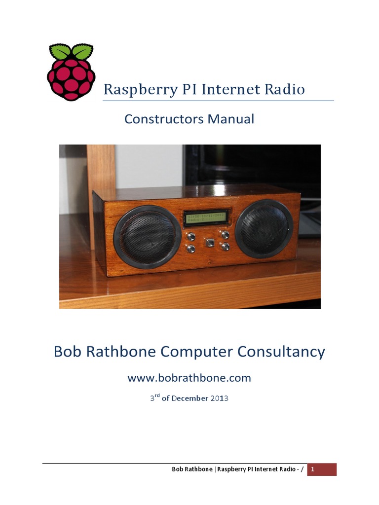 This manual describes how to create an Internet Radio using the Raspberry PI educational computer. The source and basic construction details are available from the following web site: http://www.bobrathbone.com/raspberrypi_radio.htm This manual provides a more detailed overview of construction and software installation than provided by the web site. It contains instructions for building the radio using either the HDD44780 LCD directly wired to the Raspberry PI GPIO pins or using an Adafruit RGB-backlit LCD plate for Raspberry PI. The features of the radio are: Raspberry PI running standard Music Player Daemon (MPD) Three different LCDs are supported o 2 x 16 character LCD with HD44780 controller o 4 x 20 character LCD with HD44780 controller o Adafruit LCD plate with 5 push buttons (I2C interface) Clock display or IP address display (for web interface) Five push button operation (Menu, Volume Up, Down, Channel Up, Down) Artist and track scrolling search function Plays music from a USB stick or from a Network drive (NAS) Menu option to display a single RSS news feed Web interface using snoopy and others Plays Radio streams or MP3 and WMA tracks Output either using the analogue adio jack or a USB speaker set. Controlled by an Object Orientated Python application Support for European character sets (Limited by LCD capabilities)