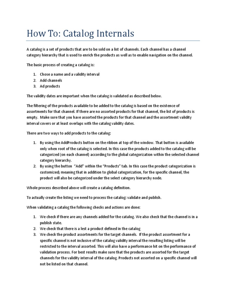 A catalog is a set of products that are to be sold on a list of channels. Each channel has a channel category hierarchy that is used to enrich the products as well as to enable navigation on the channel. The basic process of creating a catalog is: 1. Chose a name and a validity interval 2. Add channels 3. Ad products The validity dates are important when the catalog is validated as described below. The filtering of the products available to be added to the catalog is based on the existence of assortments for that channel. If there are no assorted products for that channel, the list of products is empty. Make sure that you have assorted the products for that channel and the assortment validity interval covers or at least overlaps with the catalog validity dates. There are two ways to add products to the catalog: 1. By using the AddProducts button on the ribbon at top of the window. That button is available only when root of the catalog is selected. In this case the products added to the catalog will be categorized (on each channel) according to the global categorization within the selected channel category hierarchy. 2. By using the button Add within the Products tab. In this case the product categorization is customized; meaning that in addition to global categorization, for the specific channel, the product will also be categorized under the select category hierarchy node. Whole process described above will create a catalog definition. To actually create the listing we need to process the catalog: validate and publish. When validating a catalog the following checks and actions are done: 1. We check if there are any channels added for the catalog. We also check that the channel is in a publish state. 2. We check that there is a lest a product defined in the catalog 3. We check the product assortments for the target channels. If the product assortment for a specific channel is not inclusive of the catalog validity interval the resulting listing will be restricted to the interval assorted. This will also have a performance hit on the performance of validation process. For best results make sure that the products are assorted for the target channels for the validity interval of the catalog. Products not assorted on a specific channel will not be listed on that channel.