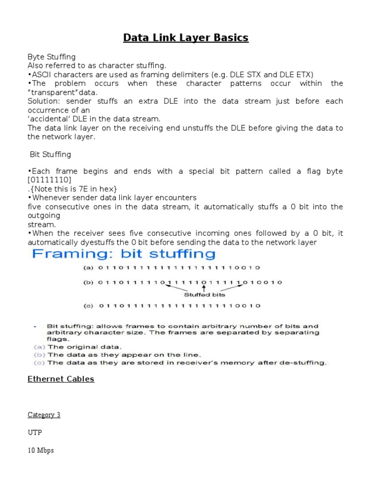 Byte Stuffing Also referred to as character stuffing. ASCII characters are used as framing delimiters (e.g. DLE STX and DLE ETX The !ro"lem occurs #hen these character !atterns occur #ithin the $trans!arent%data. Solution& sender stuffs an e'tra DLE into the data stream (ust "efore each occurrence of an )accidental* DLE in the data stream. The data lin+ layer on the recei,ing end unstuffs the DLE "efore gi,ing the data to the net#or+ layer. Bit Stuffing Each frame "egins and ends #ith a s!ecial "it !attern called a flag "yte -.//////.0 .12ote this is 3E in he'4 5hene,er sender data lin+ layer encounters fi,e consecuti,e ones in the data stream6 it automatically stuffs a . "it into the outgoing stream. 5hen the recei,er sees fi,e consecuti,e incoming ones follo#ed "y a . "it6 it automatically dyestuffs the . "it "efore sending the data to the net#or+ layer