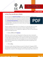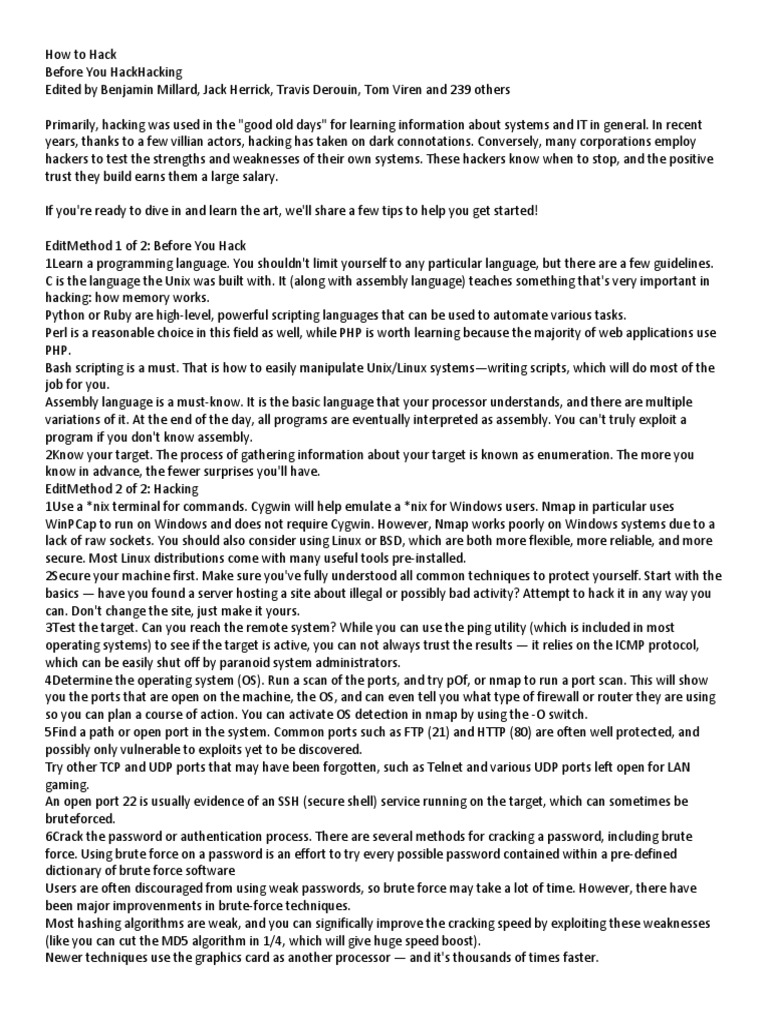 239 others Primarily, hacking was used in the "good old days" for learning information about systems and IT in general. In recent years, thanks to a few villian actors, hacking has taken on dark connotations. Conversely, many corporations employ hackers to test the strengths and weaknesses of their own systems. These hackers know when to stop, and the positive trust they build earns them a large salary. If you're ready to dive in and learn the art, we'll share a few tips to help you get started! EditMethod 1 of 2: Before You Hack 1Learn a programming language. You shouldn't limit yourself to any particular language, but there are a few guidelines. C is the language the Unix was built with. It (along with assembly language) teaches something that's very important in hacking: how memory works. Python or Ruby are high-level, powerful scripting languages that can be used to automate various tasks. Perl is a reasonable choice in this field as well, while PHP is worth learning because the majority of web applications use PHP. Bash scripting is a must. That is how to easily manipulate Unix/Linux systemswriting scripts, which will do most of the job for you. Assembly language is a must-know. It is the basic language that your processor understands, and there are multiple variations of it. At the end of the day, all programs are eventually interpreted as assembly. You can't truly exploit a program if you don't know assembly. 2Know your target. The process of gathering information about your target is known as enumeration. The more you know in advance, the fewer surprises you'll have. EditMethod 2 of 2: Hacking 1Use a *nix terminal for commands. Cygwin will help emulate a *nix for Windows users. Nmap in particular uses WinPCap to run on Windows and does not require Cygwin. However, Nmap works poorly on Windows systems due to a lack of raw sockets. You should also consider using Linux or BSD, which are both more flexible, more reliable, and more secure. Most Linux distributions come with many useful tools pre-installed. 2Secure your machine first. Make sure you've fully understood all common techniques to protect yourself. Start with the basics have you found a server hosting a site about illegal or possibly bad activity? Attempt to hack it in any way you can. Don't change the site, just make it yours. 3Test the target. Can you reach the remote system? While you can use the ping utility (which is included in most operating systems) to see if the target is active, you can not always trust the results it relies on the ICMP protocol, which can be easily shut off by paranoid system administrators. 4Determine the operating system (OS). Run a scan of the ports, and try pOf, or nmap to run a port scan. This will show you the ports that are open on the machine, the OS, and can even tell you what type of firewall or router they are using so you can plan a course of action. You can activate OS detection in nmap by using the -O switch. 5Find a path or open port in the system. Common ports such as FTP (21) and HTTP (80) are often well protected, and possibly only vulnerable to exploits yet to be discovered. Try other TCP and UDP ports that may have been forgotten, such as Telnet and various UDP ports left open for LAN gaming. An open port 22 is usually evidence of an SSH (secure shell) service running on the target, which can sometimes be bruteforced. 6Crack the password or authentication process. There are several methods for cracking a password, including brute force. Using brute force on a password is an effort to try every possible password contained within a pre-defined dictionary of brute force software Users are often discouraged from using weak passwords, so brute force may take a lot of time. However, there have been major improvenments in brute-force techniques. Most hashing algorithms are weak, and you can significally improve the cracking speed by exploiting these weaknesses (like you can cut the MD5 algorithm in 1/4, which will give huge speed boost). Newer techniques use the graphics card as another processor and it's thousands of times faster.