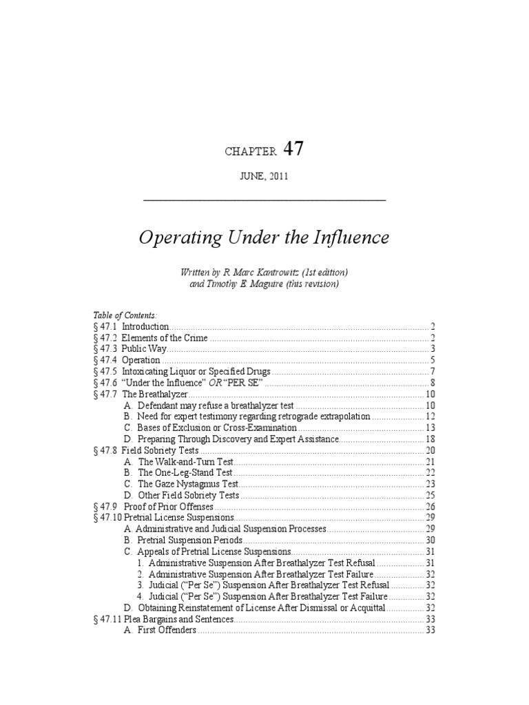 Introduction ............................................................................................................. 2 Elements of the Crime ............................................................................................ 2 Public Way .............................................................................................................. 3 Operation ................................................................................................................ 5 Intoxicating Liquor or Specified Drugs .................................................................. 7 Under the Influence OR PER SE ..................................................................... 8 The Breathalyzer ................................................................................................... 10 A. Defendant may refuse a breathalyzer test ...................................................... 10 B. Need for expert testimony regarding retrograde extrapolation ...................... 12 C. Bases of Exclusion or Cross-Examination ..................................................... 13 D. Preparing Through Discovery and Expert Assistance.................................... 18 47.8 Field Sobriety Tests .............................................................................................. 20 A. The Walk-and-Turn Test ................................................................................ 21 B. The One-Leg-Stand Test ................................................................................ 22 C. The Gaze Nystagmus Test.............................................................................. 23 D. Other Field Sobriety Tests ............................................................................. 25 47.9 Proof of Prior Offenses ........................................................................................ 26 47.10 Pretrial License Suspensions................................................................................ 29 A. Administrative and Judicial Suspension Processes ......................................... 29 B. Pretrial Suspension Periods ............................................................................ 30 C. Appeals of Pretrial License Suspensions........................................................ 31 1. Administrative Suspension After Breathalyzer Test Refusal .................... 31 2. Administrative Suspension After Breathalyzer Test Failure ..................... 32 3. Judicial (Per Se) Suspension After Breathalyzer Test Refusal .............. 32 4. Judicial (Per Se) Suspension After Breathalyzer Test Failure ............... 32 D. Obtaining Reinstatement of License After Dismissal or Acquittal ................ 32 47.11 Plea Bargains and Sentences ................................................................................ 33 A. First Offenders ............................................................................................... 33