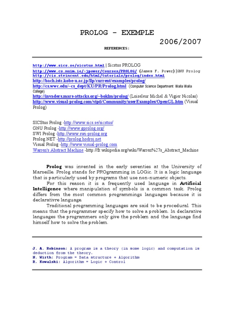 http://invaders.mars-attacks.org/~boklm/prolog/ (Loiseleur Michel & Vigier Nicolas) http://www.visual-prolog.com/vip6/Community/userExamples/OpenGL.htm (Visual Prolog) SICStus Prolog -http://www.sics.se/sicstus/ GNU Prolog -http://www.gprolog.org/ SWI Prolog -http://www.swi-prolog.org Prolog.NET -http://prolog.hodroj.net Visual Prolog -http://www.visual-prolog.com Warren's Abstract Machine -http://fr.wikipedia.org/wiki/Warren%27s_Abstract_Machine Prolog was invented in the early seventies at the University of Marseille. Prolog stands for PROgramming in LOGic. It is a logic language that is particularly used by programs that use non-numeric objects. For this reason it is a frequently used language in Artificial Intelligence where manipulation of symbols is a common task. Prolog differs from the most common programmings languages because it is declarativre language. Traditional programming languages are said to be procedural. This means that the programmer specify how to solve a problem. In declarative languages the programmers only give the problem and the language find himself how to solve the problem.