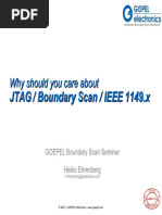 In the future, image designs will be created dynamically, or on the y, and the chip size, I/O type for each legal pin location, and localized wiring and placement terrains for different chip regions will be specied separately. This is another inection point in the transition from ASICs to SoCs. DFT automation Before 1999, IBM Blue Logic ASICs offered insertion of scan chains into the logical description (netlist) of the chip. This included mapping of ip-ops to LSSD latches, connecting the latches into scan chains, balancing the number of bits in each scan chain to maximize test efciency, and connecting test clocks to the latches. However, many aspects of the DFT logic remained application-specic, including chip-level connections of scan chains and test clocks to I/O cells, the logic required to share functional I/O signals and test I/O signals on the same chip pin, and boundary scan structures. Additionally, many ASIC customers require compliance to the IEEE 1149.1 test standard [25], a method to control multiple chips in a board or product for chip-interconnect testing and other customer-dened DFT methods unique to their products or corporate test strategies. To address automation of chip-level and custom test logic, IBM developed the IOSpecDFT tool [26]. Like many tools used in the industry, IOSpecDFT provides an automated insertion capability of I/Os and IEEE 1149.1compliant structures. But IOSpecDFT goes further by