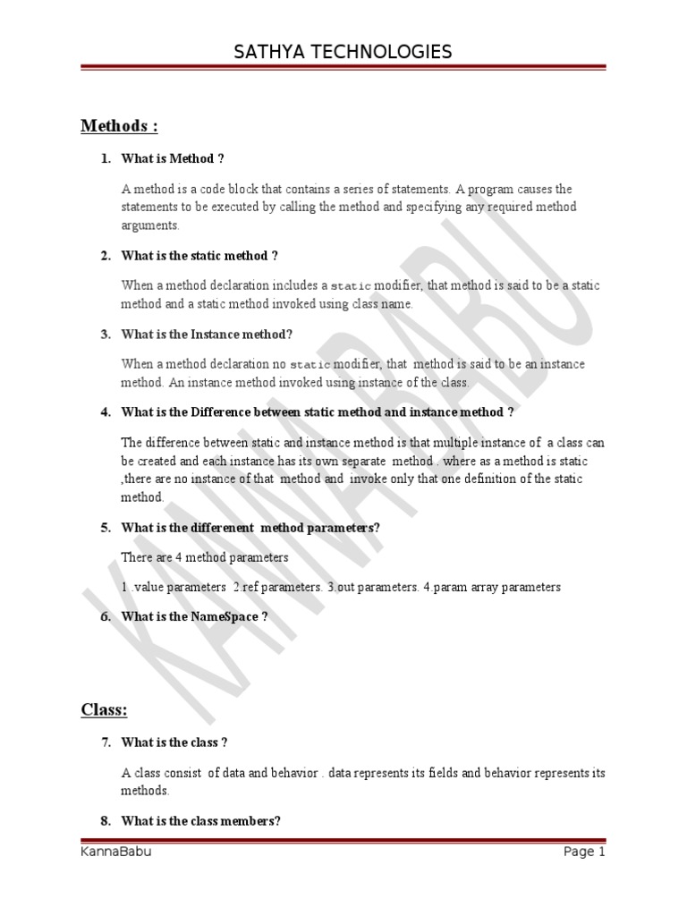1. What is Method ? A method is a code block that contains a series of statements. A program causes the statements to be executed by calling the method and specifying any required method arguments. 2. What is the static method ? When a method declaration includes a static modifier, that method is said to be a static method and a static method invoked using class name. 3. What is the Instance method? When a method declaration no static modifier, that method is said to be an instance method. An instance method invoked using instance of the class. 4. What is the Difference between static method and instance method ? The difference between static and instance method is that multiple instance of a class can be created and each instance has its own separate method . where as a method is static ,there are no instance of that method and invoke only that one definition of the static method. 5. What is the differenent method parameters? There are 4 method parameters .value parameters !.ref parameters. ".out parameters. 4.param array parameters 6. What is the Name pace ?