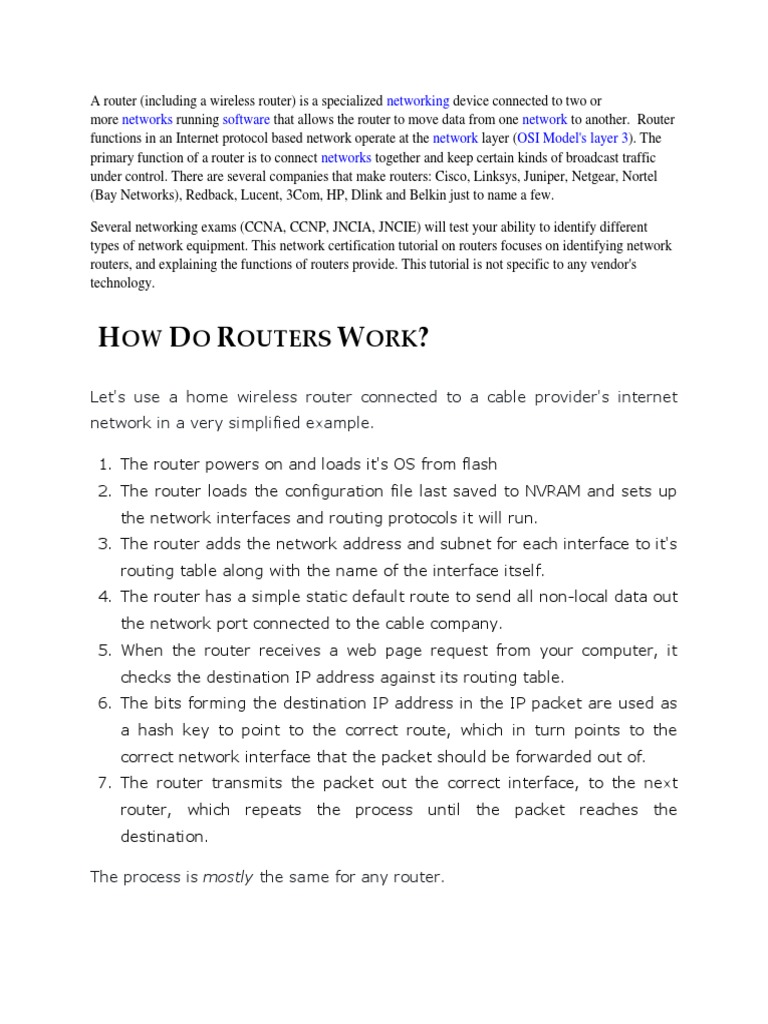 the router to move data from one network to another. Router functions in an Internet protocol based network operate at the network layer (OSI Model's layer 3). The primary function of a router is to connect networks together and keep certain kinds of broadcast traffic under control. There are several companies that make routers: Cisco, Linksys, Juniper, Netgear, Nortel (Bay Networks), Redback, Lucent, 3Com, HP, Dlink and Belkin just to name a few. Several networking exams (CCNA, CCNP, JNCIA, JNCIE) will test your ability to identify different types of network equipment. This network certification tutorial on routers focuses on identifying network routers, and explaining the functions of routers provide. This tutorial is not specific to any vendor's technology.
