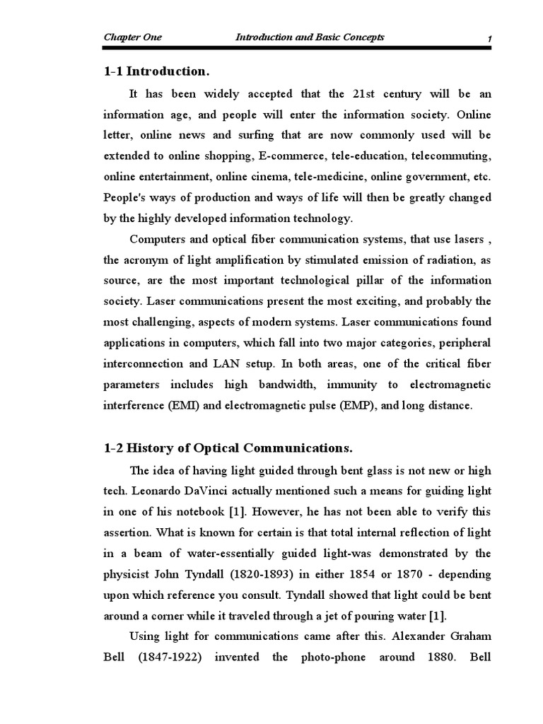 It has been widely accepted that the 21st century will be an information age, and people will enter the information society. Online letter, online news and surfing that are now commonly used will be extended to online shopping, E-commerce, tele-education, telecommuting, online entertainment, online cinema, tele-medicine, online government, etc. eople!s ways of production and ways of life will then be greatly changed by the highly developed information technology. "omputers and optical fiber communication systems, that use lasers , the acronym of light amplification by stimulated emission of radiation, as source, are the most important technological pillar of the information society. #aser communications present the most exciting, and probably the most challenging, aspects of modern systems. #aser communications found applications in computers, which fall into two ma$or categories, peripheral interconnection and #%& setup. In both areas, one of the critical fiber parameters includes high bandwidth, immunity to electromagnetic interference 'E(I) and electromagnetic pulse 'E( ), and long distance.
