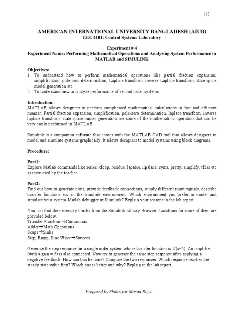 EEE 4101: Control Systems Laboratory Experiment # 4 Experiment Name: Performing Mathematical Operations and Analyzing System Performance in MATLAB and SIMULINK Objectives: 1. To understand how to perform mathematical operations like partial fraction expansion, simplification, pole-zero determination, Laplace transform, inverse Laplace transform, state-space model generation etc. 2. To understand how to analyze performance of second order systems. Introduction: MATLAB allows designers to perform complicated mathematical calculations in fast and efficient manner. Partial fraction expansion, simplification, pole-zero determination, laplace transform, inverse laplace transform, state-space model generation are some of the mathematical operation that can be very easily performed in MATLAB. Simulink is a companion software that comes with the MATLAB CAD tool that allows designers to model and simulate systems graphically. It allows designers to model systems using block diagrams. Procedure: Part1: Explore Matlab commands like series, cloop, residue, lapalce, ilpalace, syms, pretty, simplify, tf2ss etc as instructed by the teacher. Part2: Find out how to generate plots, provide feedback connections, supply different input signals, describe transfer functions etc. in the simulink environment. Which environment you prefer to model and simulate your system-Matlab debugger or Simulink? Explain your reasons in the lab report. You can find the necessary blocks from the Simulink Library Browser. Locations for some of them are provided below. Transfer Function Continuous Adder Math Operations Scope Sinks Step, Ramp, Sine Wave Sources Generate the step response for a single order system whose transfer function is 1/(s+5). An amplifier (with a gain = 5) is also connected. Now try to generate the same step response after applying a negative feedback. How can this be done? Compare the two responses. Which response reaches the steady state value first? Which one is better and why? Explain in the lab report.