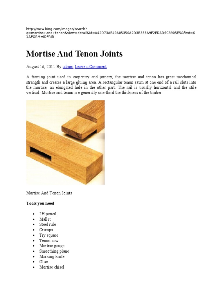 August 16, 2011 By admin Leave a Comment A framing joint used in carpentry and joinery, the mortise and tenon has great mechanical strength and creates a large gluing area. A rectangular tenon sa n at one end of a rail slots into the mortise, an elongated hole in the other part. !he rail is usually hori"ontal and the stile vertical. #ortise and tenon are generally one$third the thic%ness of the tim&er.