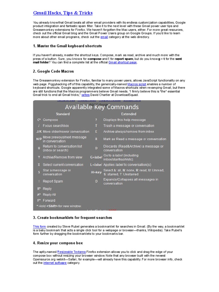 press of a button. Sure, you know c for compose and ! for report spam, but do you know g + t for the sent