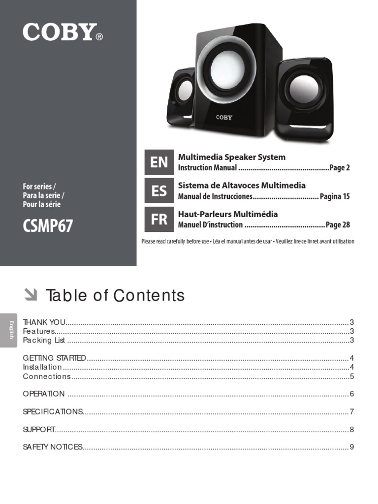 If you experience a problem with this device, please check our website at www.cobyusa.com for Frequently Asked Questions (FAQ) and firmware updates. If these resources do not resolve the problem, please contact Technical Support. Address Email Web Phone COBY Electronics Technical Support 150 Knowlton Way Savannah, GA 31407 techsupport@cobyusa.com www.cobyusa.com 800-727-3592: 718-416-3197: MondayFriday, 8:30AM9:00PM EST Saturday, 9:00AM-5:30PM EST MondayFriday, 8:00AM5:30PM EST