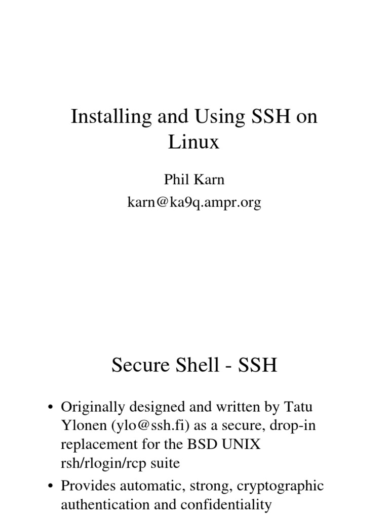 Originally designed and written by Tatu Ylonen (ylo@ssh.fi) as a secure, drop-in replacement for the BSD UNIX rsh/rlogin/rcp suite Provides automatic, strong, cryptographic authentication and confidentiality Remarkably easy to install and use