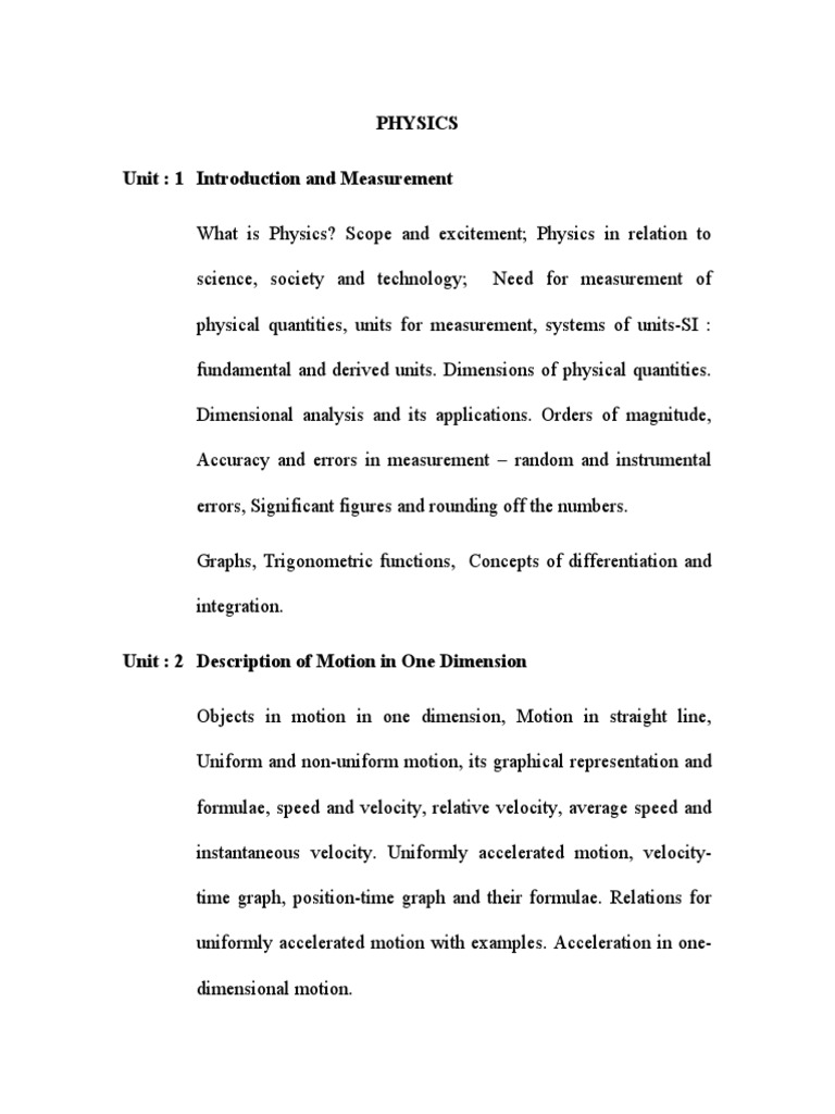 physical quantities, units for measurement, systems of units-SI : fundamental and deri ed units! "imensions of physical quantities! "imensional analysis and its applications! #rders of magnitude, $ccuracy and errors in measurement % random and instrumental errors, Significant figures and rounding off the num&ers! 'raphs, (rigonometric functions, )oncepts of differentiation and integration! Unit : 2 Description of Motion in One Dimension #&*ects in motion in one dimension, +otion in straight line, ,niform and non-uniform motion, its graphical representation and formulae, speed and elocity, relati e elocity, a erage speed and instantaneous elocity! ,niformly accelerated motion, elocity-