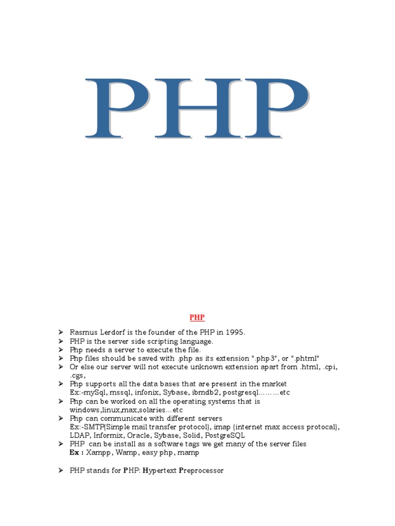 language. Php needs a server to execute the file. Php files should be saved with .php as its extension ".php3", or ".phtml" Or else our server will not execute unknown extension apart from .html, .cpi, .cgs, Php supports all the data bases that are present in the market Ex:-mySql, mssql, infonix, Sybase, ibmdb2, postgresqletc Php can be worked on all the operating systems that is windows,linux,max,solariesetc Php can communicate with different servers Ex:-SMTP(Simple mail transfer protocol), imap (internet max access protocal), LDAP, Informix, Oracle, Sybase, Solid, PostgreSQL PHP can be install as a software tags we get many of the server files Ex : Xampp, Wamp, easy php, mamp