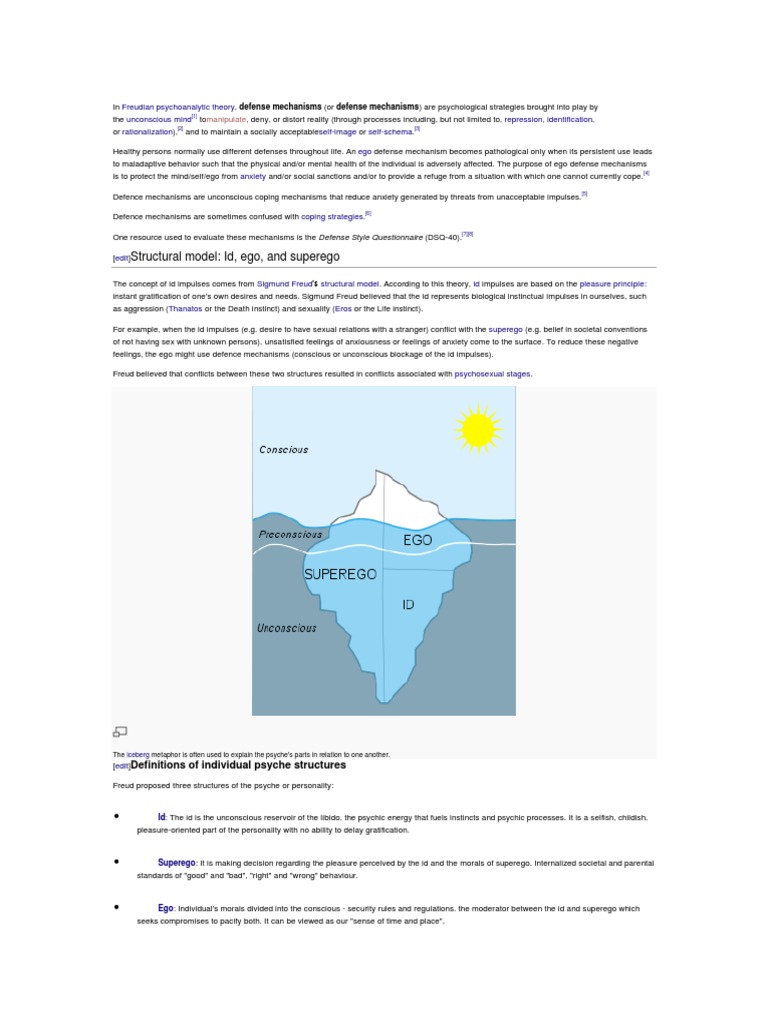 unconscious mind[1] tomanipulate, deny, or distort reality (through processes including, but not limited to, repression, identification, or rationalization),[2] and to maintain a socially acceptableself-image or self-schema.[3] Healthy persons normally use different defenses throughout life. An ego defense mechanism becomes pathological only when its persistent use leads to maladaptive behavior such that the physical and/or mental health of the individual is adversely affected. The purpose of ego defense mechanisms is to protect the mind/self/ego from anxiety and/or social sanctions and/or to provide a refuge from a situation with which one cannot currently cope.[4] Defence mechanisms are unconscious coping mechanisms that reduce anxiety generated by threats from unacceptable impulses. [5] Defence mechanisms are sometimes confused with coping strategies.[6] One resource used to evaluate these mechanisms is the Defense Style Questionnaire (DSQ-40).[7][8] [edit]Structural
